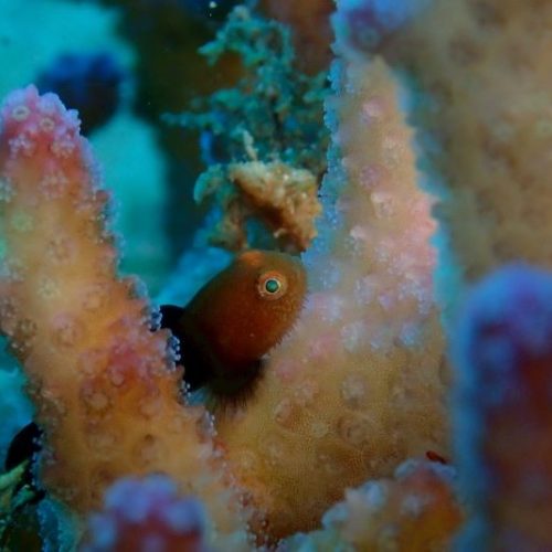 10匹程度で同じサンゴに住んでるイチモンジコバンハゼの幼魚ちゃん。